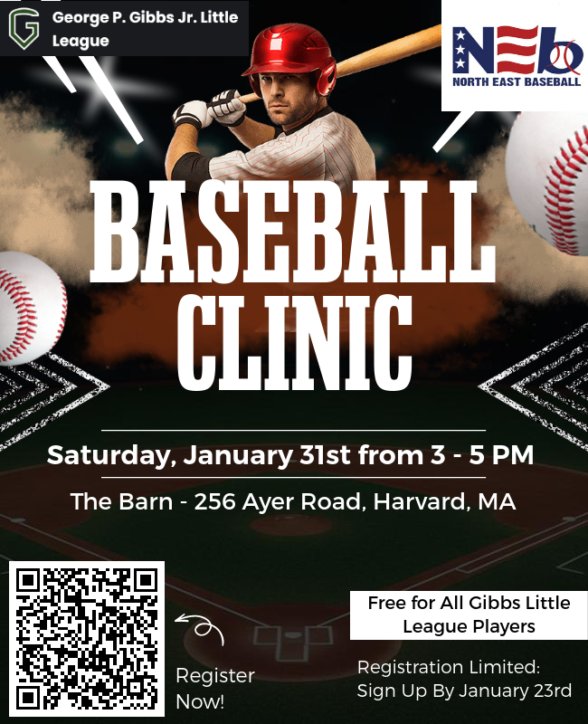 Northeast Baseball is offering a free instructional baseball clinic exclusive to Gibbs players (Tee-Ball through Majors) on January 31st from 3-5 pm at The Barn in Harvard MA. This is a fantastic opportunity to get back in the baseball mindset and to learn from top coaches and players.